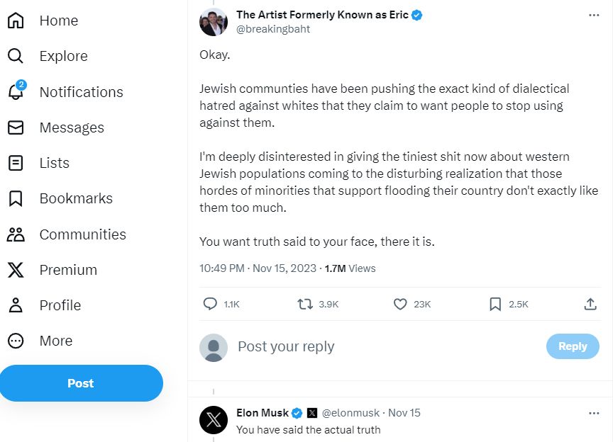 A látogatás előzménye, hogy pár napja a techmilliárdos saját platformján antiszemita botrányba keveredett, ugyanis egyetértését fejezte ki az X-en megjelent bejegyzéssel, amely azt állította, hogy a zsidók gyűlöletet szítanak a fehér emberek ellen. Musk azt írta kommentben a poszt alá, hogy az „a tényleges igazság”. A bejegyzés az úgynevezett „nagy lakosságcserére” utalt, amelynek lényege, hogy a zsidók és a baloldaliak a fehér lakosság etnikai és kulturális felváltását más etnikumú bevándorlókkal tervezi, ez pedig a „fehérek népirtásához” vezet.