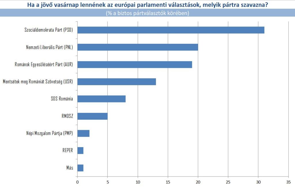 A biztos pártszavazók között a PSD-t 31 százalékra mérték, a második helyen a Nemzeti Liberális Párt (PNL) áll 20 százalékkal, majd az AUR következik 19 százalékkal. Az USR 13 százalékra, az SOS Románia 8 százalékra számíthat. Az RMDSZ éppen csak elérné az ötszázalékos bejutási küszöböt, Dacian Cioloș pártja, a Reper viszont már nem.