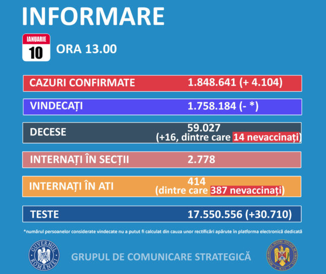 A Stratégiai Kommunikációs Csoport (GCS) hétfői közlése szerint az utóbbi 24 órában 4104 személyt diagnosztizáltak SARS-CoV-2-fertőzéssel és 16 koronavírussal összefüggésbe hozható halálesetet regisztráltak.